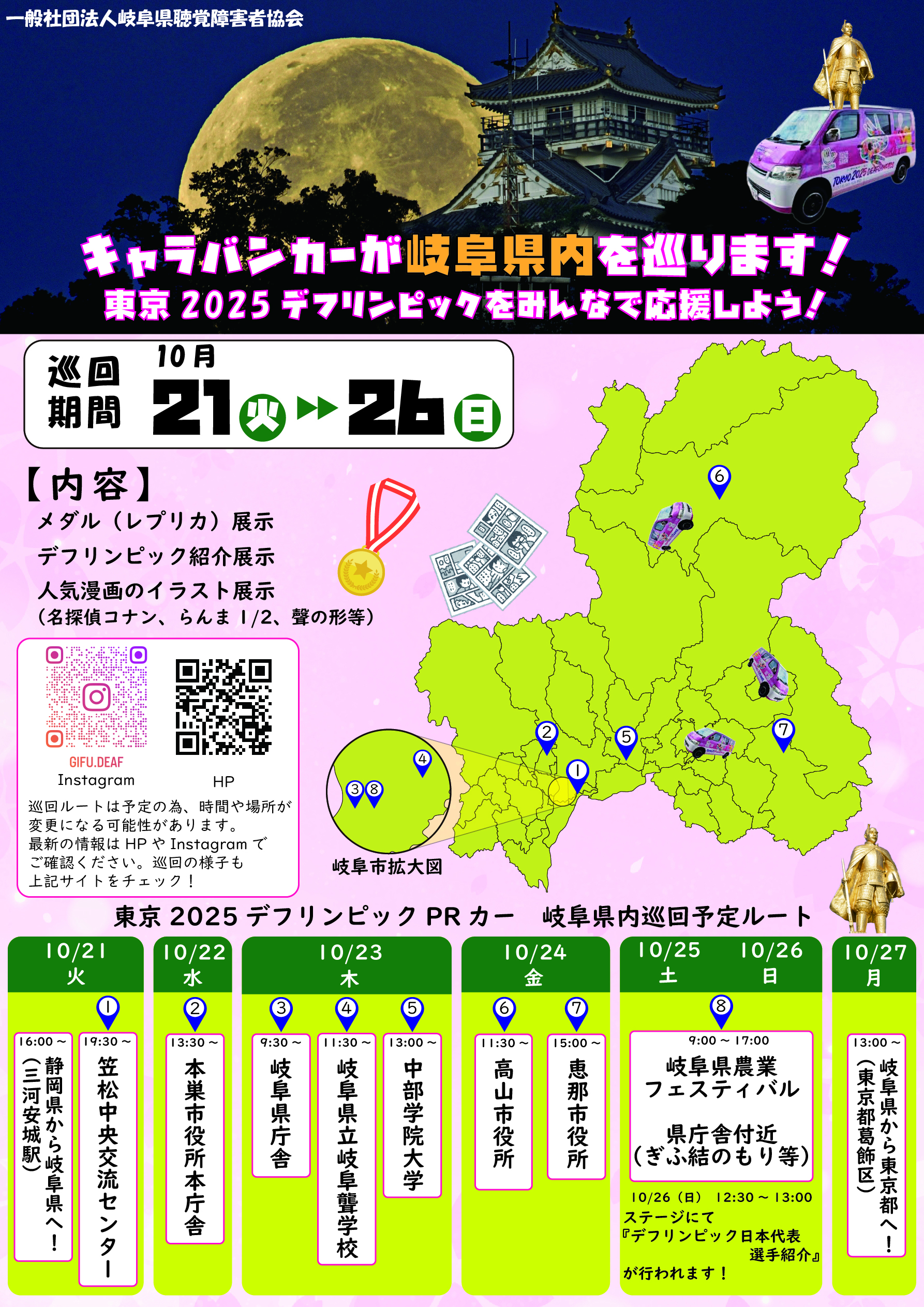 東京2025デフリンピックPRカー 岐阜県巡行日:10月21日(火)~10月26日(日) スケジュール 10月1日時点の情報です。 情報発信 キャラバンカーの様子を、YouTube・Instagramにて発信予定です。 YouTubeはこちら Instagramはこちら