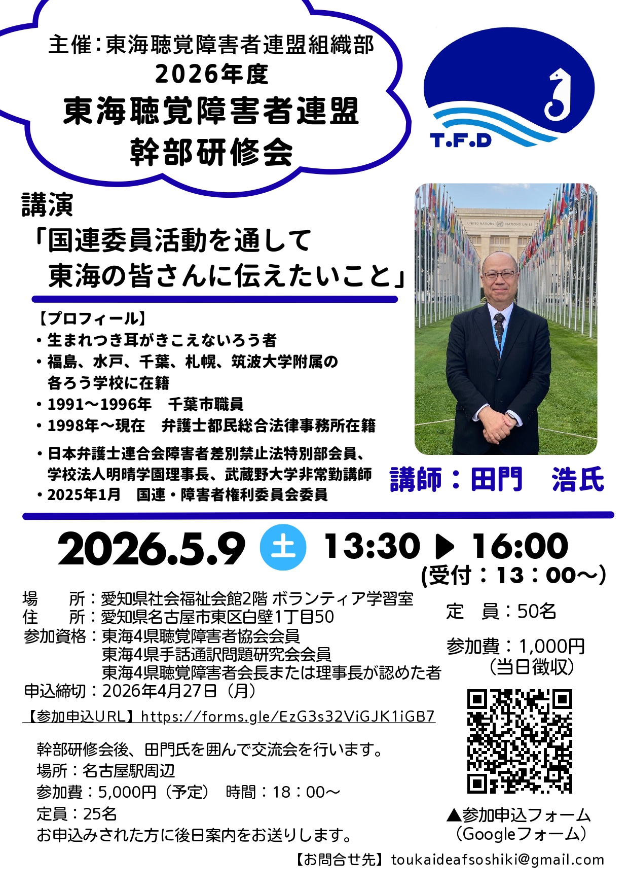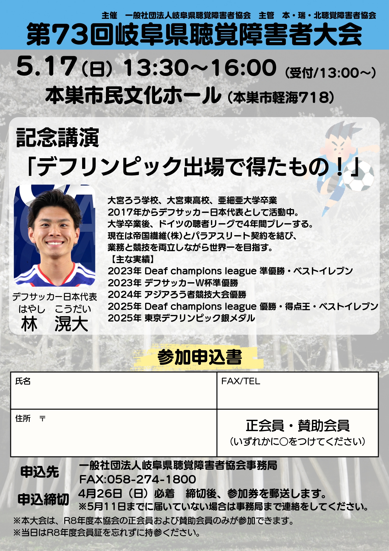 事務局より 第73回岐阜県聴覚障害者大会 R8年度正会員・賛助会員のみ参加いただけます。お申し込みは事務局まで 東海聴覚障害者連盟 幹部研修会 申込はこちら 手話の日&手話言語の国際デー ブルーライトアップ